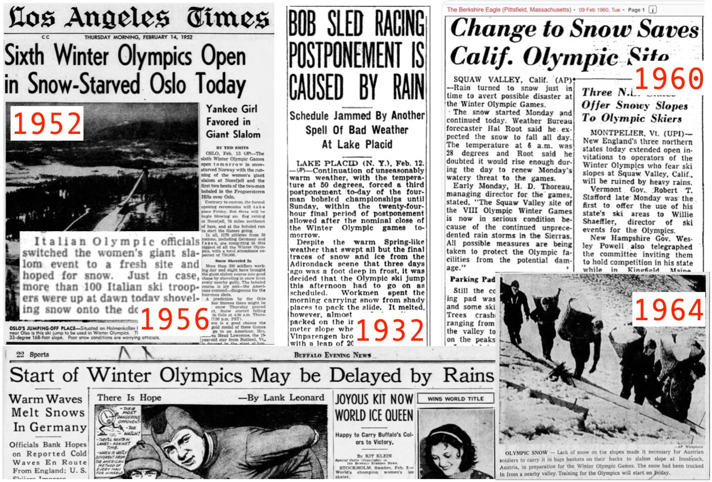 V minulosti bývalo sněhu také málo, ale na rozdíl od současnosti kolem toho bylo i méně hysterie. Důkazem je přehled historických novinových článků, které vyšly v době konání zimních olympijských her.