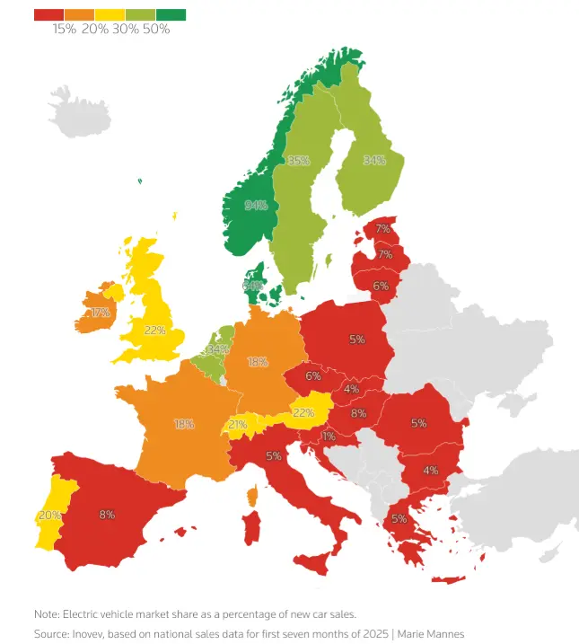 Graf: Podíl prodeje (v %) BEV v Evropských zemích v prvních sedmi měsících 2025