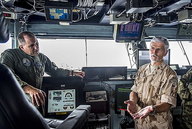 Na snímku z roku 2017 generál Petr Pavel na můstku letadlové lodi hovoří s kapitánem Willem Penningtonem, velícím důstojníkem lodi USS George H.W. Bush. Zdroj: Wikimedia Commons, dílo federální vlády USA, určené pro volné sdílení.