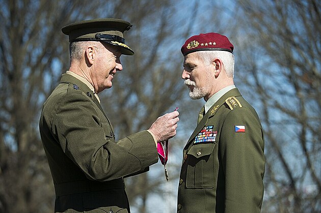 Generál námořní pěchoty Joseph F. Dunford ml., předseda Sboru náčelníků štábů, 8. března 2018 vyznamenává generála Petra Pavla. Tento soubor je pod licencí Creative Commons Attribution 2.0 Generic, volné sdílení.